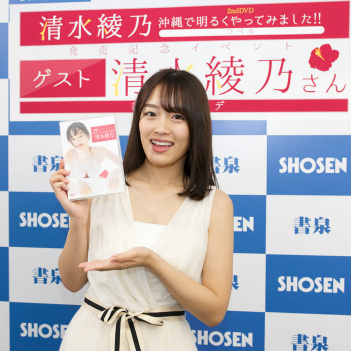 タレントの清水綾乃さんをお迎えして、 DVD「沖縄で明るくやってみました!!」(コペル)発売記念イベントを2020年1月26日に書泉グランデで開催しました。