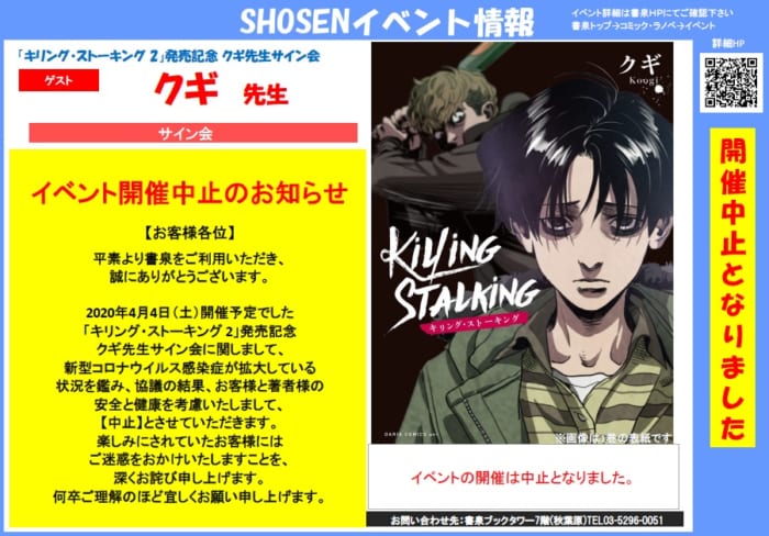 2020年4月4日(土)開催予定でした「キリング・ストーキング 2」発売記念 クギ先生サイン会に関しまして、