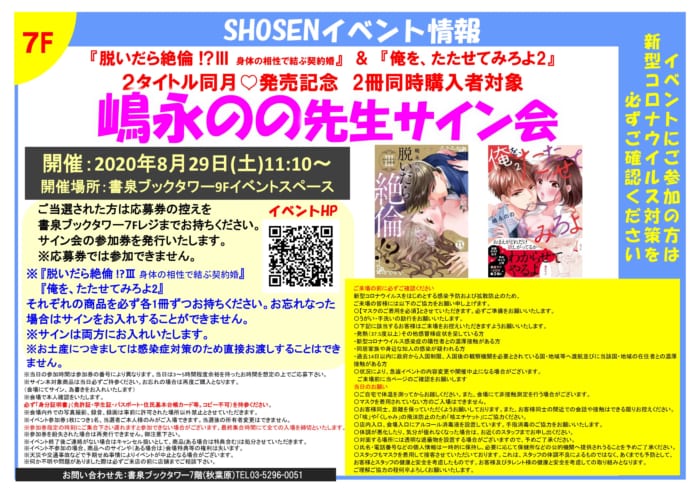 6月7日(日)に書泉ブックタワー(東京・秋葉原)にて開催を予定しておりました 『脱いだら絶倫 !?Ⅲ 身体の相性で結ぶ契約婚』『俺を、たたせてみろよ2』同月♡発売記念 嶋永のの先生サイン会につきまして、新型コロナウイルス感染症に関する緊急事態宣言の5月末まで延長という事態を鑑み、協議致しました結果、嶋永のの先生、お客様の健康、安全を考慮し、イベントを一旦延期とさせて頂きます。