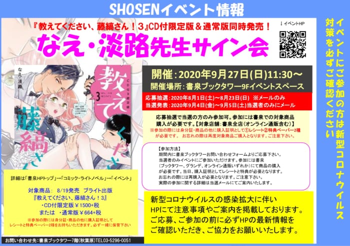 【サイン会応募抽選】【9/27(日)開催】なえ・淡路先生「教えてください、藤縞さん! 3」サイン会