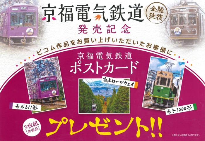期間中、ビコムの全商品対象で買われた方に”京福電気鉄道 ポストカード3枚セット”