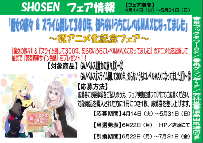 『魔女の旅々』&『スライム倒して300年、知らないうちにレベルMAXになってました』祝アニメ化記念フェア抽選係