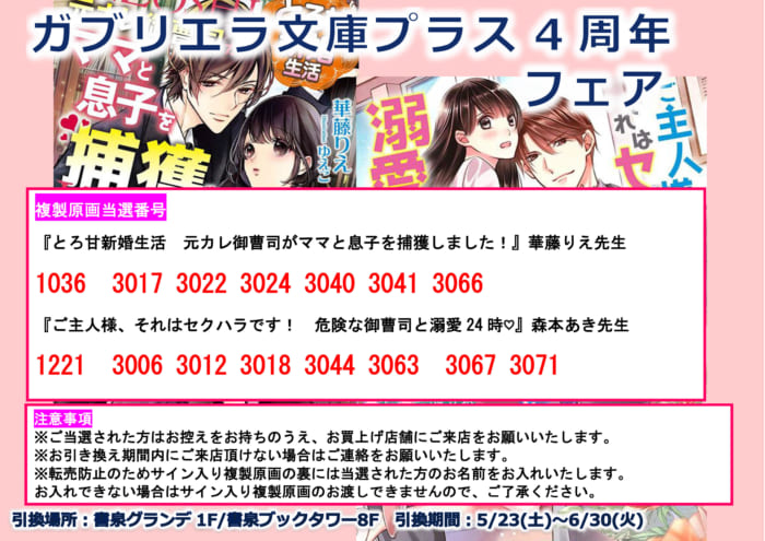 ガブリエラ文庫プラス4周年フェア直筆サイン入り複製原画の当選番号発表です!
