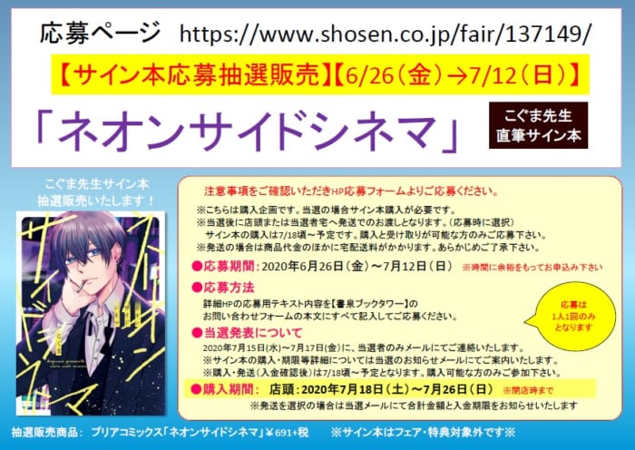 【メール応募抽選販売】【6/26-7/12受付】こぐま先生「ネオンサイドシネマ」サイン本抽選販売お申込み