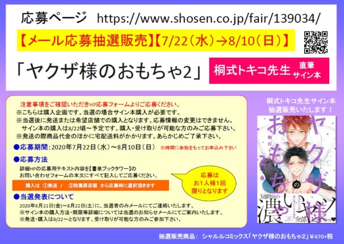 【メール応募抽選販売】【7/22-8/10受付】桐式トキコ先生「ヤクザ様のおもちゃ2」サイン本抽選販売お申込み