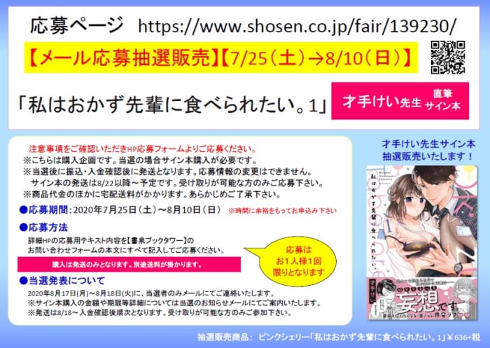 【メール応募抽選販売】【7/25-8/10受付】才手けい先生「私はおかず先輩に食べられたい。1」サイン本抽選販売お申込み