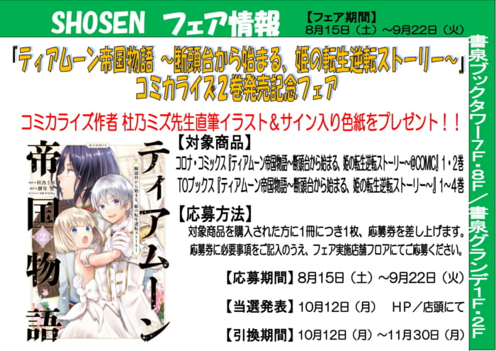 TOブックス『ティアムーン帝国物語~断頭台から始まる、姫の転生逆転ストーリー~』のコミックス第2巻の発売を記念して、コミカライズ作者 杜乃ミズ先生直筆イラスト&サイン入り色紙の展示&抽選プレゼントを開催します!!