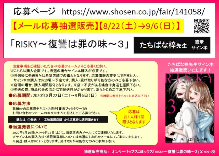 【メール応募抽選販売】【8/22-9/6受付】たちばな梓先生「RISKY〜復讐は罪の味〜3」サイン本抽選販売お申込み