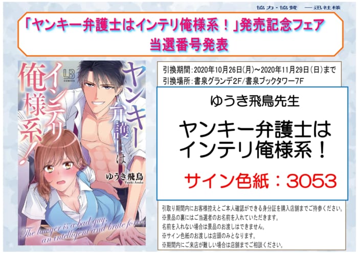 LOVEBITESコミックス「ヤンキー弁護士はインテリ俺様系!(1)」発売記念フェアの直筆サイン入り色紙の当選番号の発表になります!
