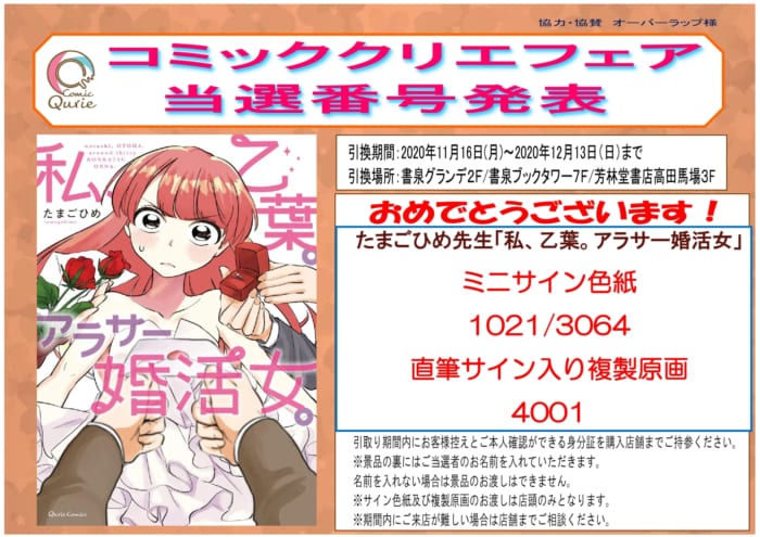 クリエコミックスフェア たまごひめ先生「私、乙葉。アラサー婚活女」の直筆サイン色紙・直筆サイン入り複製原画の当選番号の発表になります!