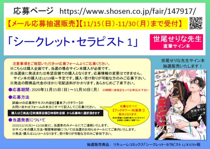 世尾せりな先生「シークレット・セラピスト 1」サイン本抽選販売お申込み