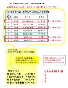・希望するタイトルを欲しい順にすべて記入してお申込み下さい。希望するタイトルの数に制限はありません。