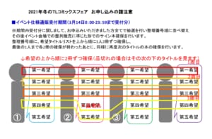 お申込み頂いた方すべてを対象に抽選を行い、整理番号を付けさせていただき、その番号順に希望タイトルリストを上から順に1人2冊ずつ確保し、