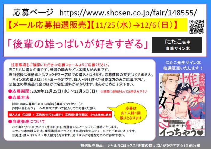 にたこ 先生『後輩の雄っぱいが好きすぎる』サイン本抽選販売お申込み