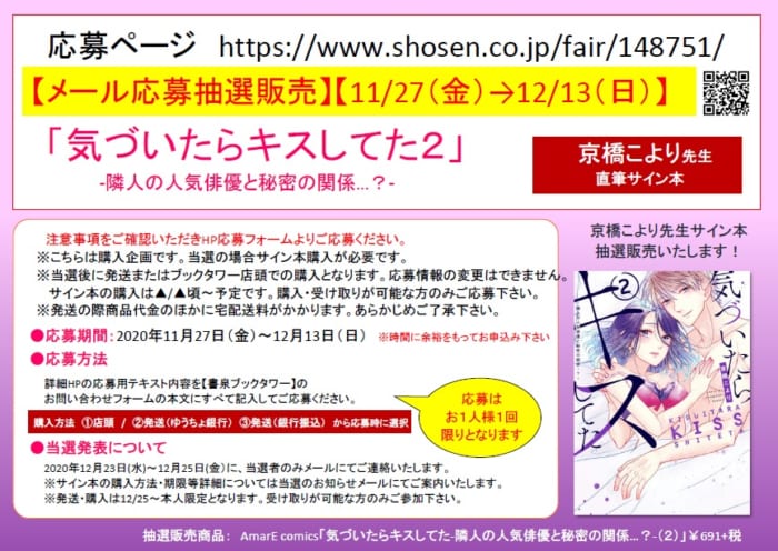 京橋こより 先生「気づいたらキスしてた2」サイン本抽選販売お申込み