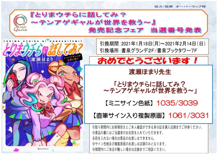 渡瀬ほまり先生『とりまウチらに話してみ? ~テンアゲギャルが世界を救う~』発売記念フェアの直筆サイン色紙・直筆サイン入り複製原画の当選番号の発表になります!