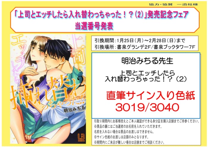 「上司とエッチしたら挿れ替わっちゃった!?(2)」発売記念フェアの直筆サイン入り色紙の当選番号の発表になります!