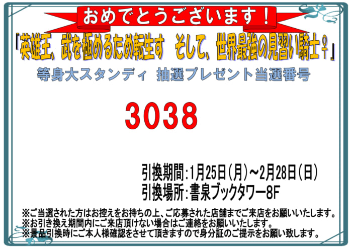 『英雄王、武を極めるため転生す そして、世界最強の見習い騎士♀』応援フェア 等身大パネルの当選番号発表です!