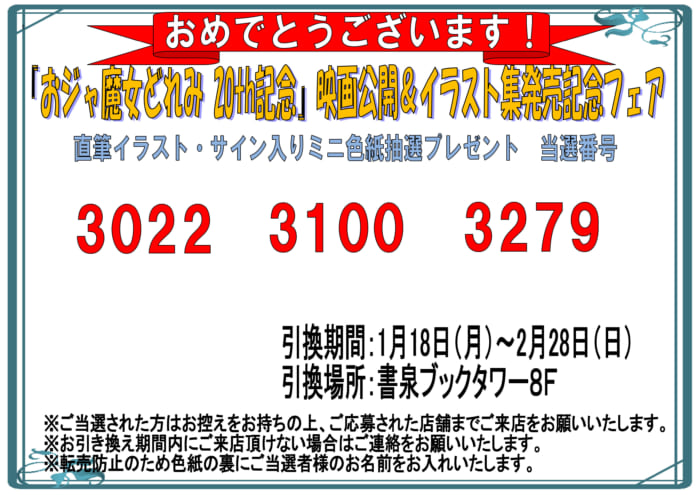 直筆イラスト&サイン入りミニ色紙の当選番号発表です!