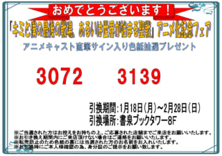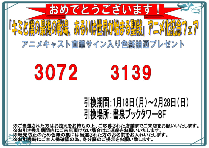 アニメキャスト直筆サイン入り色紙の当選番号発表です!