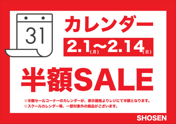 2021年2月1日(月)より、書泉グランデ(神保町)・ブックタワー(秋葉原)にてカレンダー商品の半額セールを行います。
