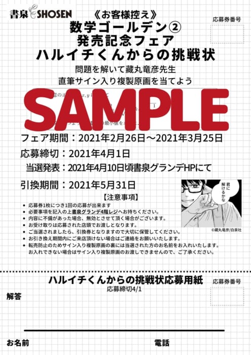 〒101-0051 千代田区神田神保町1-3-2 書泉グランデ4階 数学ゴールデン応募係