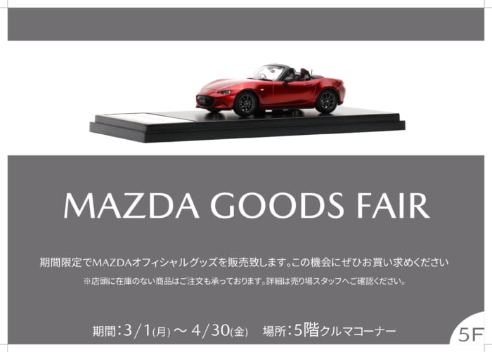 MAZDA GOODS FAIR 期間限定でマツダオフィシャルグッズを販売致します。この機会にぜひお買い求めください。 ※店頭に在庫のない商品はご注文も承っております。詳細は売り場スタッフへご確認ください。
