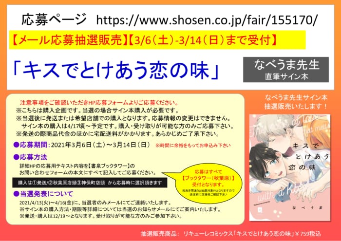なべうま先生「キスでとけあう恋の味」サイン本抽選販売お申込み