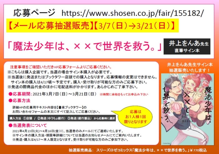 井上をんあ 先生「魔法少年は、××で世界を救う。」サイン本抽選販売お申込み