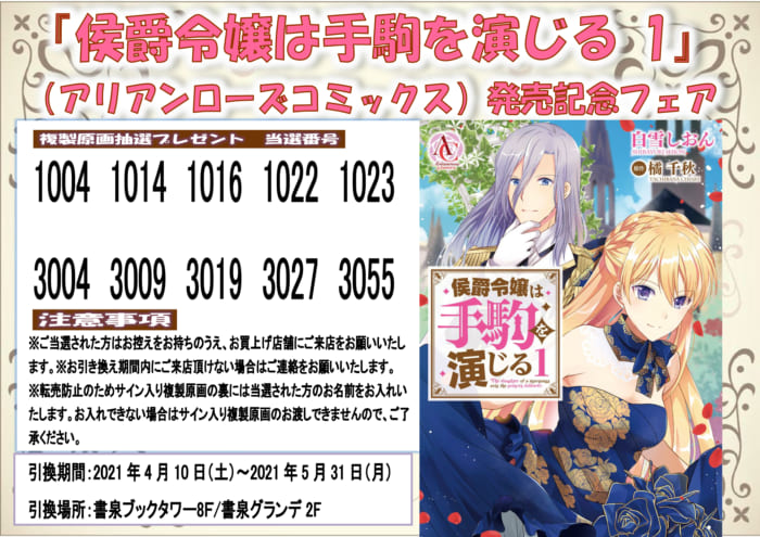 アリアンローズコミックス『侯爵令嬢は手駒を演じる1』発売記念フェア当選発表です。