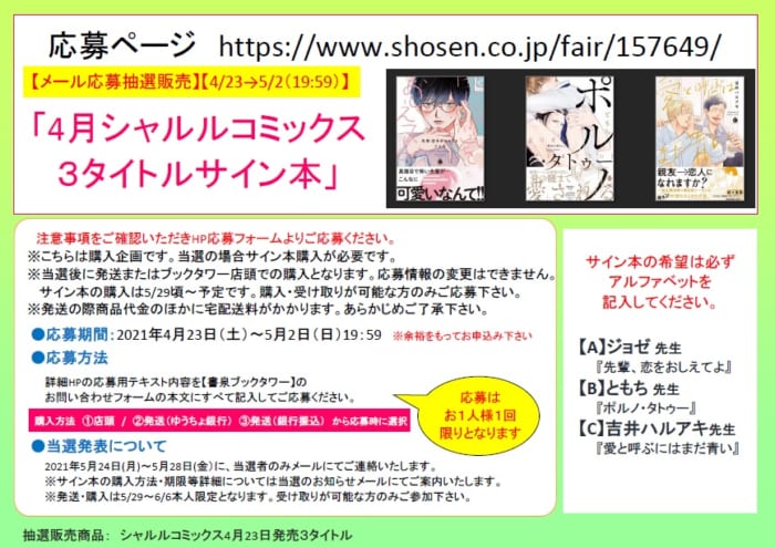 4月シャルルコミックス3タイトルサイン本