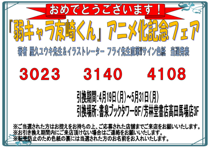 著者 屋久ユウキ先生&イラストレーター フライ先生直筆Wサイン色紙の当選番号発表です!