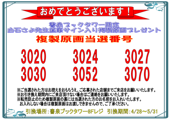 白石さよ先生直筆サイン入り複製原画プレゼントの当選者の発表になります。