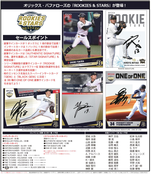 リニューアルしたEPOCH社『ルーキーズ&スターズ』プレミアムベースボールカードに、若手選手の台頭や大物外国人選手の加入で注目のオリックス・バファローズ登場!