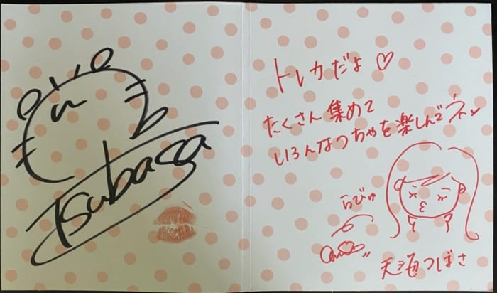 ・トレカ撮影時チェキ1枚(サイン無し) ・色紙(見開き) 1 点 ※直筆サイン、直筆メッセージ、生キスが入った色紙です。