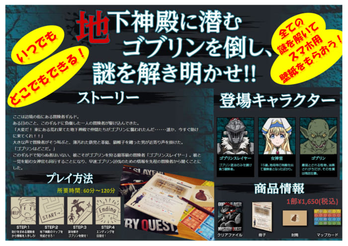 「ゴブリンスレイヤー 謎解きクエスト ~地下神殿に潜むゴブリンを殲滅せよ~」は、原作シリーズ累計発行部数700万部の大人気ダークファンタジーアニメ『ゴブリンスレイヤー』をテーマとした家で楽しめる「謎解きゲーム」です!