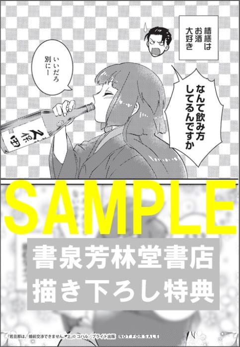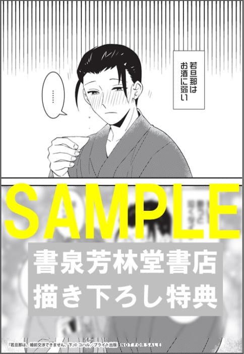 1月22日発売 ラブコフレコミックス『若旦那は、婚前交渉できません。』上・下巻それぞれをお買い上げの方に各巻書泉限定描き下ろしペーパーをプレゼント!