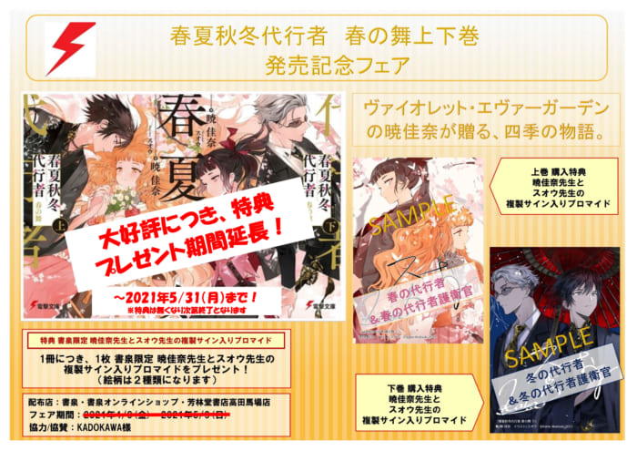 ・春夏秋冬代行者 春の舞 上巻:暁佳奈先生とスオウ先生の複製サイン入りプロマイド1枚(春の代行者&春の護衛官のイラスト)